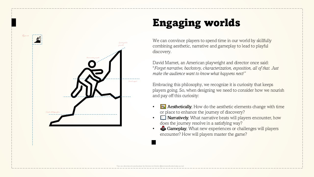 We can convince players to spend time in our world by skillfully combining aesthetic, narrative and gameplay to lead to playful discovery.
