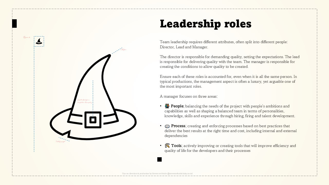 •🧑🏽🤝🧑🏽 People; balancing the needs of the project with people’s ambitions and capabilities as well as shaping a balanced team in terms of personalities, knowledge, skills and experience through hiring, firing and talent development.