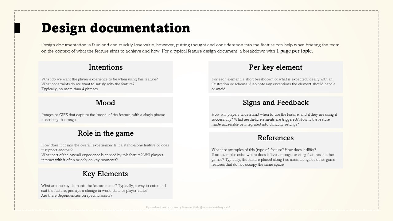 •👓 Research; learning all you can about a feature, from comparative games, other media, life itself.