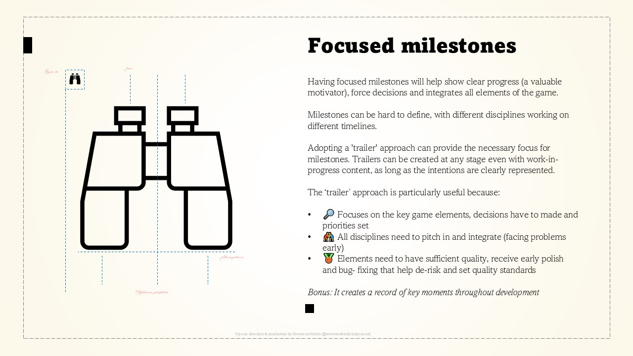 Adopting a 'trailer' approach can provide the necessary focus for milestones. Trailers can be created at any stage even with work-in-progress content, as long as the intentions are clearly represented.