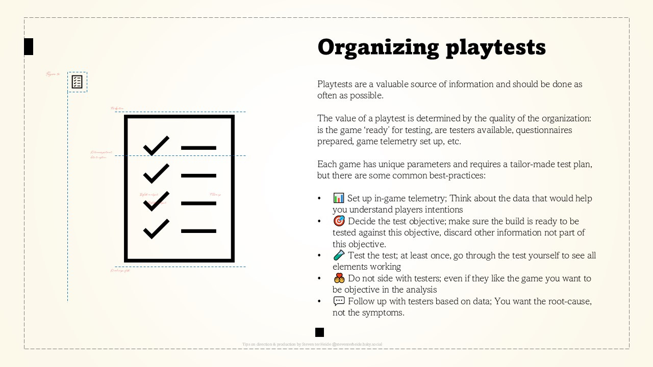 The value of a playtest is determined by the quality of the organization: is the game ‘ready’ for testing, are testers available, questionnaires prepared, game telemetry set up, etc.