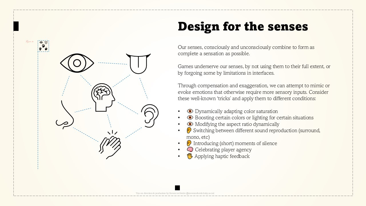 Through compensation and exaggeration, we can attempt to mimic or evoke emotions that otherwise require more sensory inputs. Consider these well-known ‘tricks’ and apply them to different conditions: