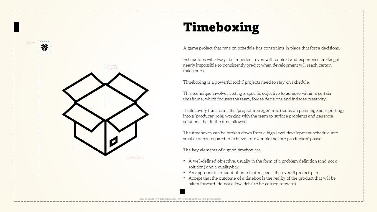 The timeboxes can be broken down from a high-level development schedule into smaller steps required to achieve for example the ‘pre-production’ phase.
