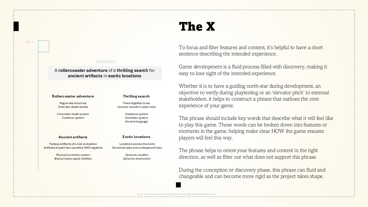 Whether it is to have a guiding north-star during development, an objective to verify during playtesting or an ‘elevator pitch’ to external stakeholders, it helps to construct a phrase that outlines the core experience of your game.