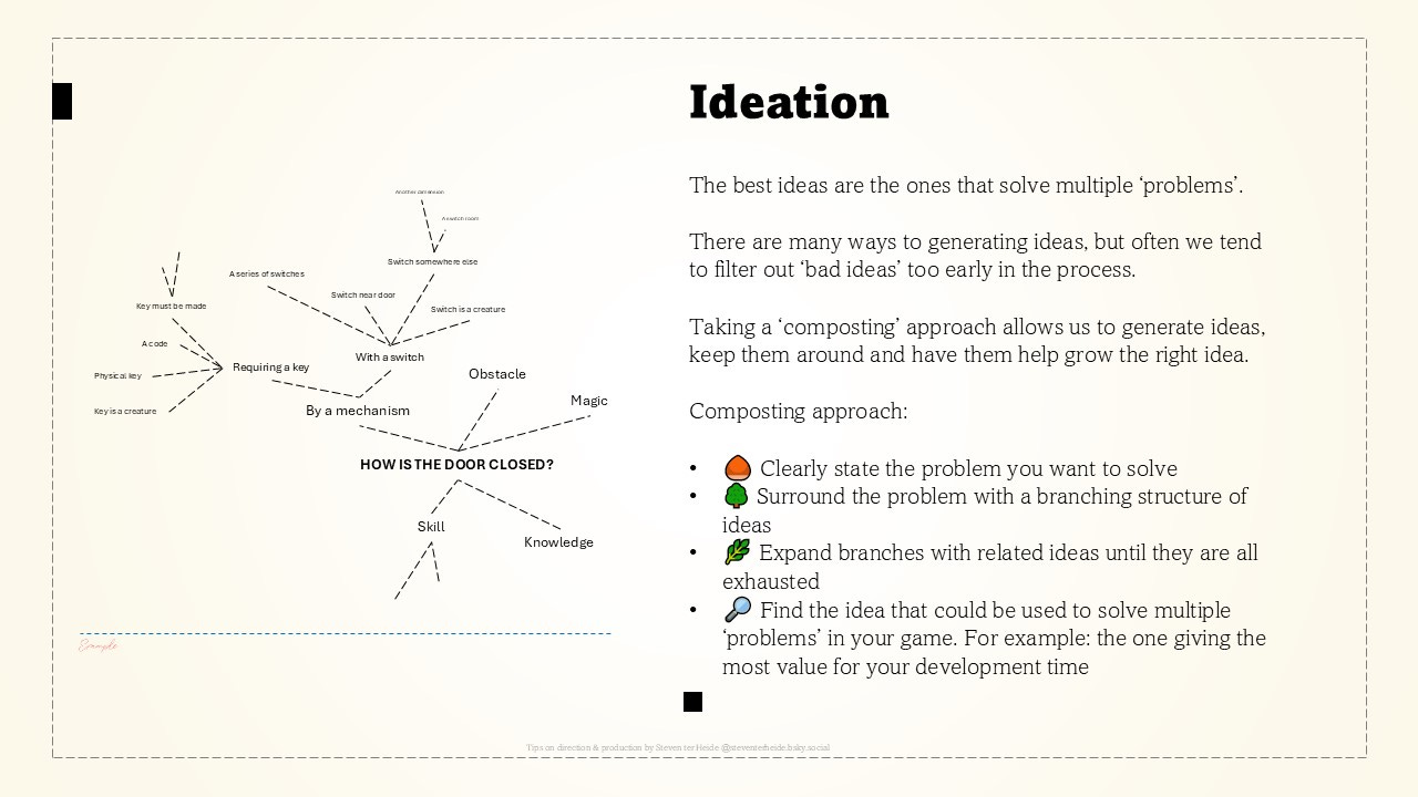 •🔎 Find the idea that could be used to solve multiple ‘problems’ in your game. For example: the one giving the most value for your development time