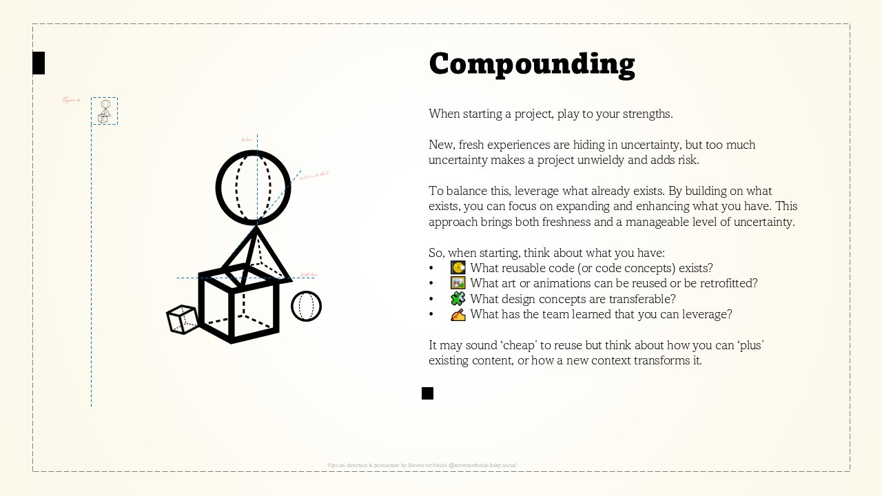 To balance this, leverage what already exists. By building on what exists, you can focus on expanding and enhancing what you have. This approach brings both freshness and a manageable level of uncertainty..