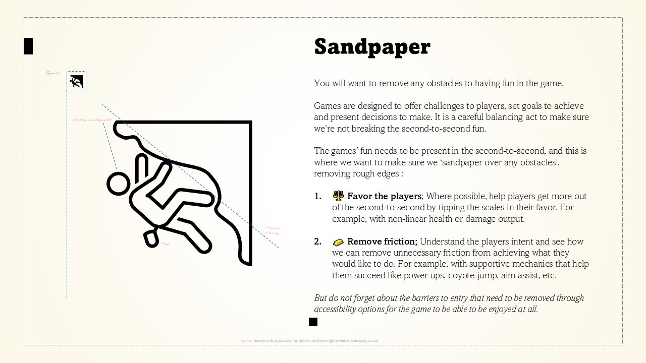 The games’ fun needs to be present in the second-to-second, and this is where we want to make sure we ‘sandpaper over any obstacles’, removing rough edges :