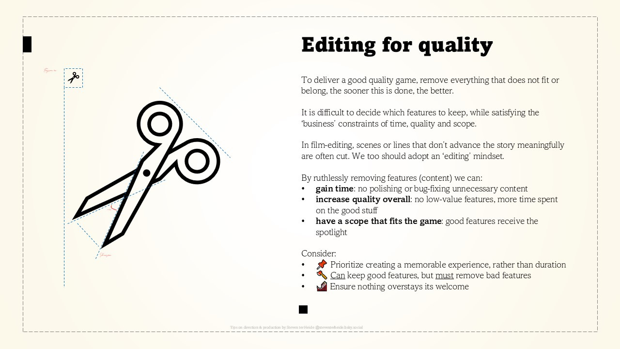 To deliver a good quality game, remove everything that does not fit or belong, the sooner this is done, the better.